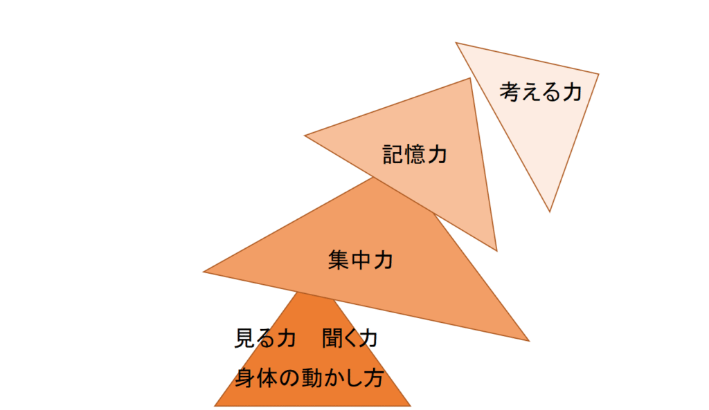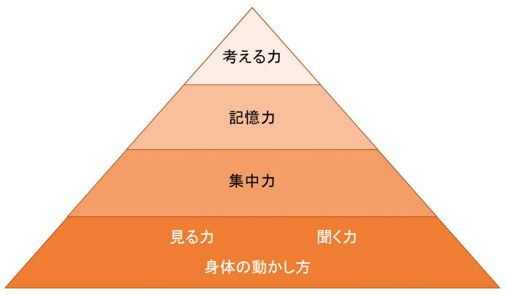 ピラミッドの土台になっている「見る力」「聞く力」「触覚」「身体の動かし方」がしっかり積み上げられていないと、その上の「集中力」「記憶力」「考える力」もガタガタになってしまいます。
