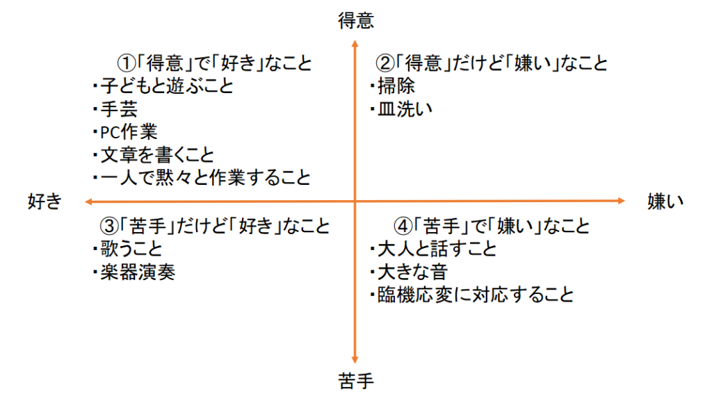 こんな風に、「苦手で嫌いなこと」や「苦手だけど好きなこと」から「得意で好きなこと」に方向転換することで、働きやすさは大きく変わってきます。