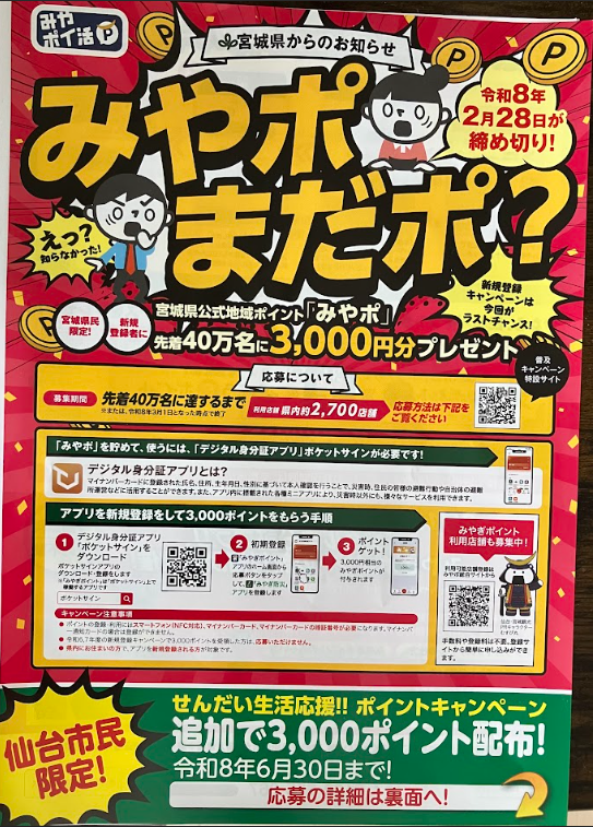 宮城県民限定で、「ポケットサイン」というアプリにマイナンバーカードを登録すると、3,000円分のポイントがもらえます。
