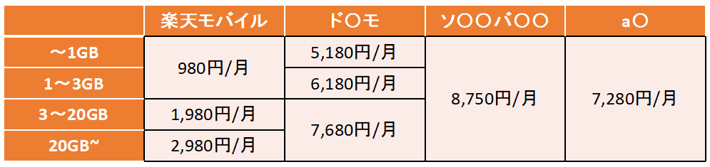 私が使っている楽天モバイル(格安SIM代表)と、スマホ3大キャリアの代表的なプラン料金をまとめてみました⇓⇓