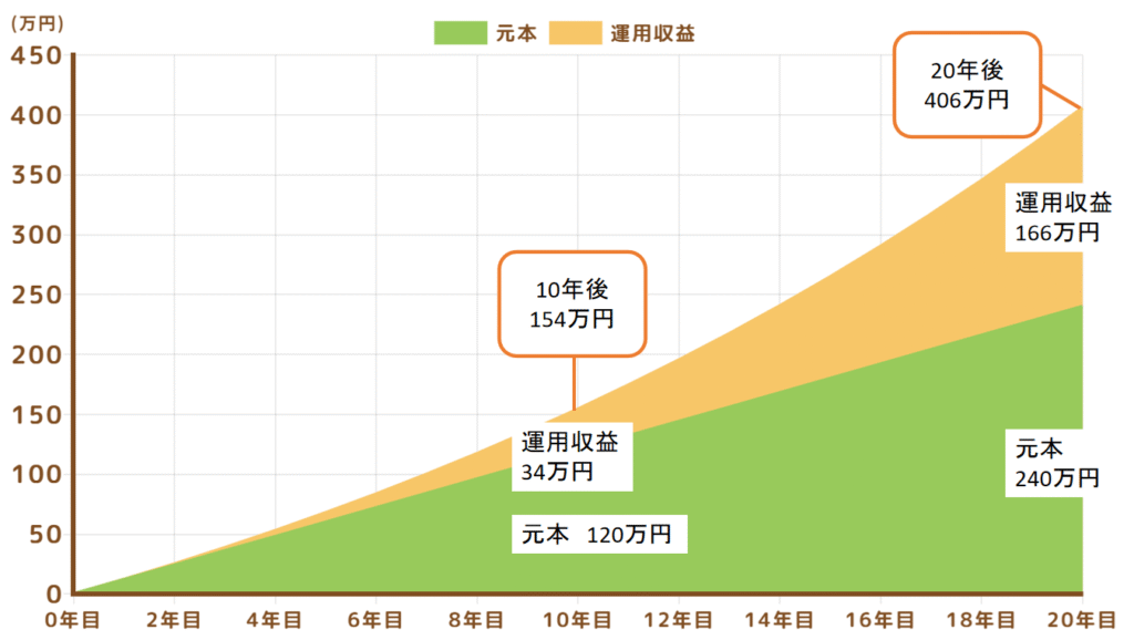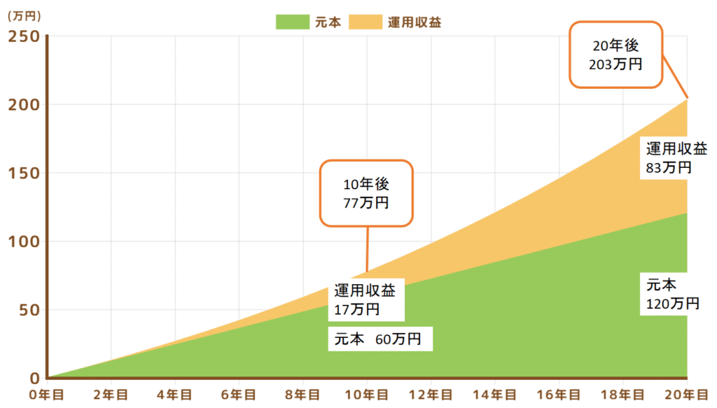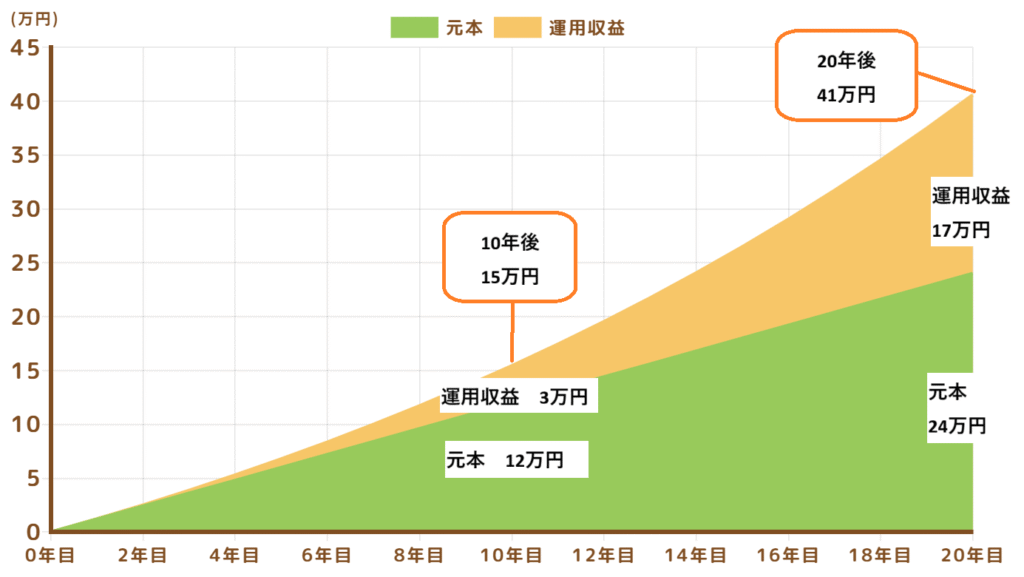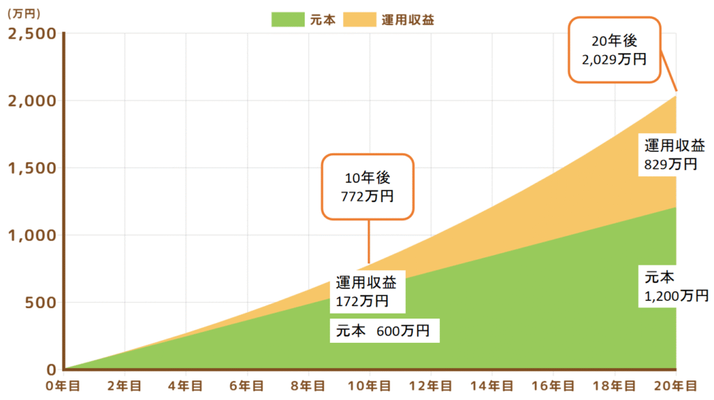 年利5%(平均すると毎年5%ずつお金が増える見込み)という条件でお金を積み立てていくと、こんな風に増えていきます。