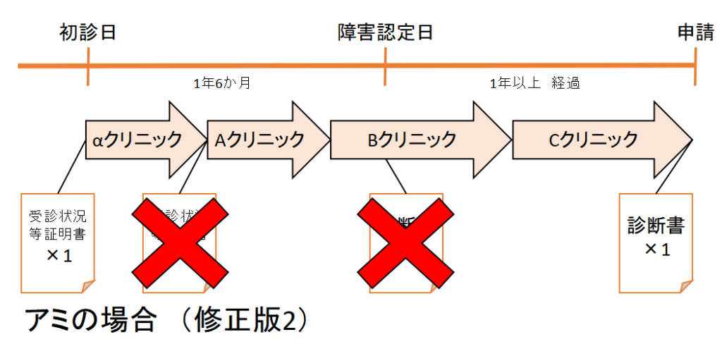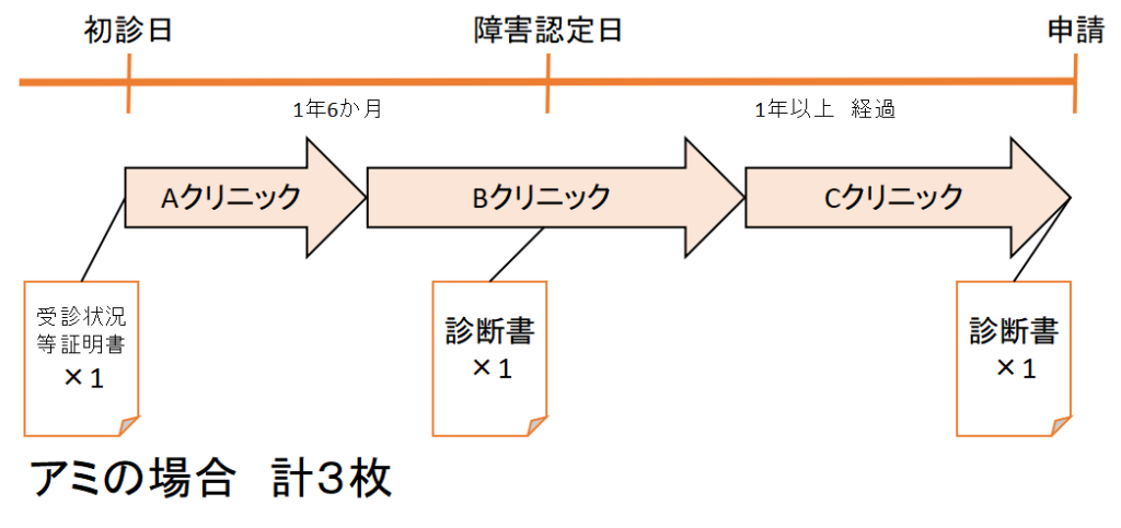 (戸籍謄本、受診状況等証明書×2通(αクリニック・Aクリニック)、診断書×1通(Cクリニック))