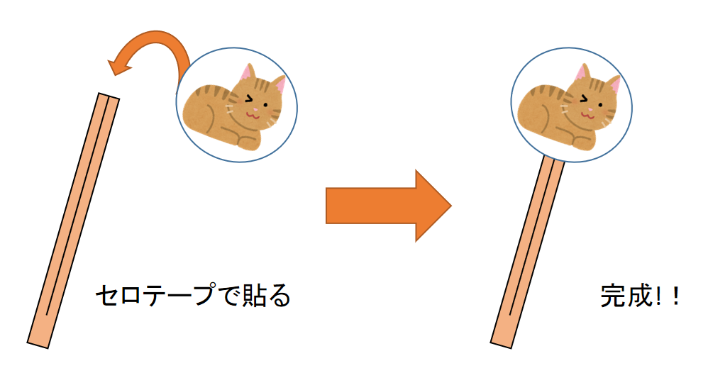 割りばしの先に、セロテープでイラストを貼るだけです。